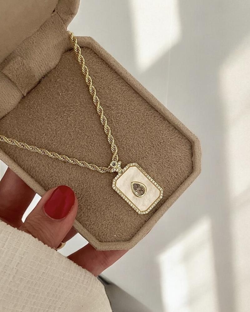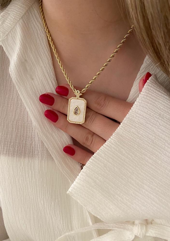 مزدان بقلادة بشكل دمعة تتوسط لوحة من اللون العاجي الهادئ، ومحاطة بإطار ناعم مرصع بفصوص زركون لامعة تضيف لمسة من الفخامة.