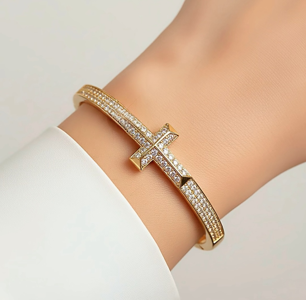 تألقي بلمسة من الفخامة العصرية مع هذا السوار الذهبي الراقي، المستوحى من التصاميم الشهيرة لعلامة المجوهرات العالمية المعروفة بأناقتها الخالدة. يتميز السوار بتصميم حرف “T” البارز والمرصّع بفصوص براقة تضيف له لمسة من الترف والرقي.