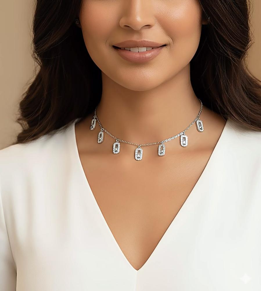 يتميز بتفاصيل دقيقة وانسيابية على شكل سلاسل رفيعة أو أحجار لامعة (حسب الطراز)، ما يجعله مثاليًا للارتداء اليومي أو المناسبات الخاصة. سواء نسقته مع فستان سهرة أو إطلالة كاجوال راقية، سيضفي هذا الشوكر سحرًا لا يُقاوم على مظهرك.