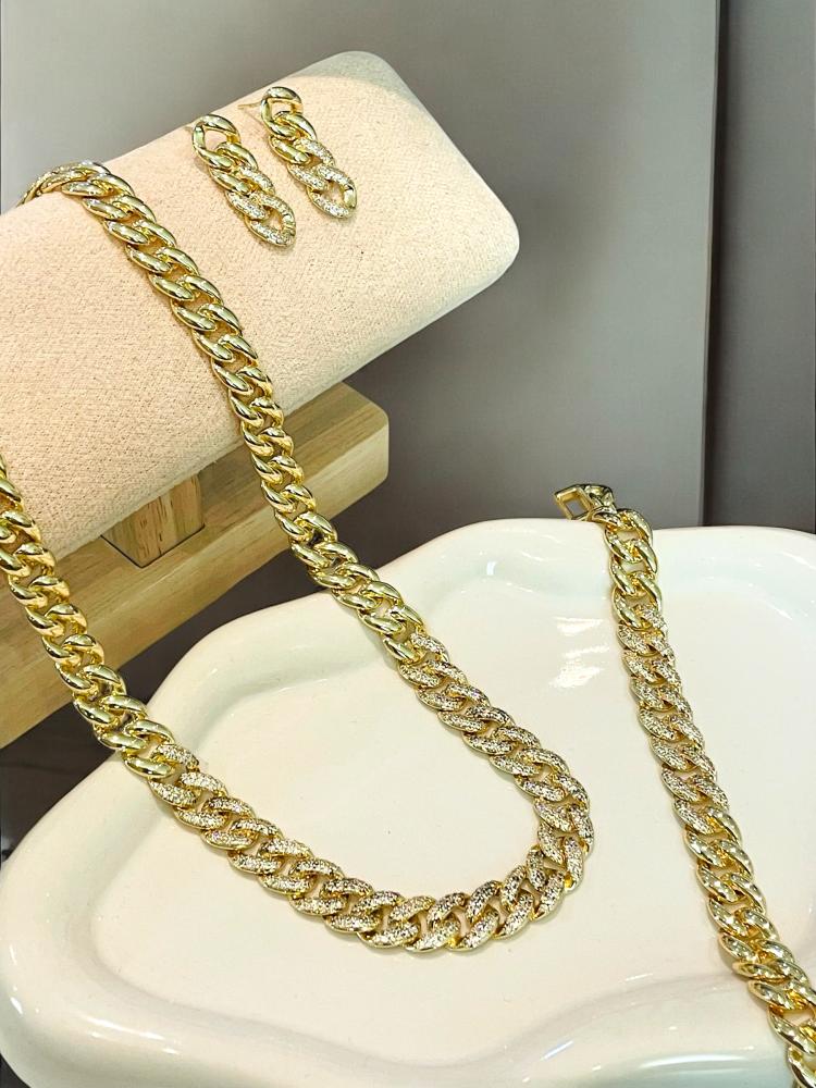 طقم أنيق بتصميم عصري وفاخر، مكوّن من سلسلة جنزير أنثوية بتفاصيل دقيقة تبرز جمال العنق، مصنوع من خامة عالية الجودة ومطلي بطبقة ذهبية لامعة تضفي عليه لمسة راقية.