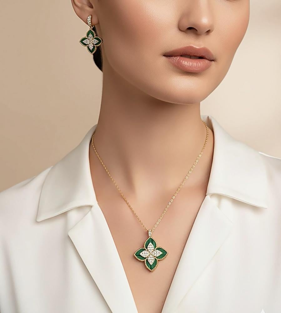 امنحي إطلالتك لمسة من الفخامة والأنوثة مع طقم السلسال والحلق MS-031، مستوحى من تصاميم روبيرتو كوين الراقية. مطلي بطبقة ذهبية عالية الجودة بألوان جذابة: الأبيض والأخضر، ليمنحك تنوعًا يناسب كل الأذواق والمناسبات. بتفاصيل زهرية أنيقة مرصعة بأحجار براقة، يعكس الطقم ذوقاً راقياً وأناقة لا تضاهى.