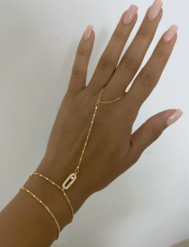 الكف يأتي بسلسال ناعم يلتف حول المعصم ويتصل بخاتم بنفس التصميم، مما يمنح يدك جمالاً لا يُقاوم.