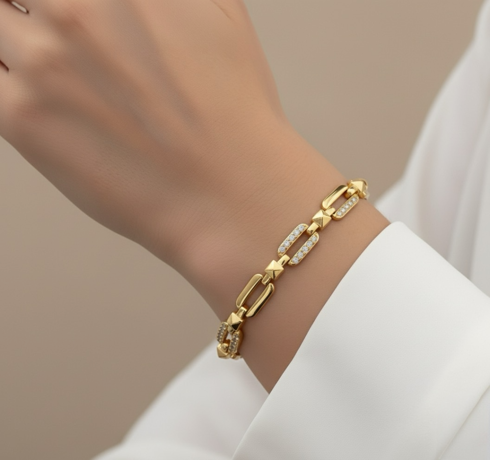 إسوارة مطلية ذهب شكل مستطيلات حبه ساده وحبه زركون . MB-320