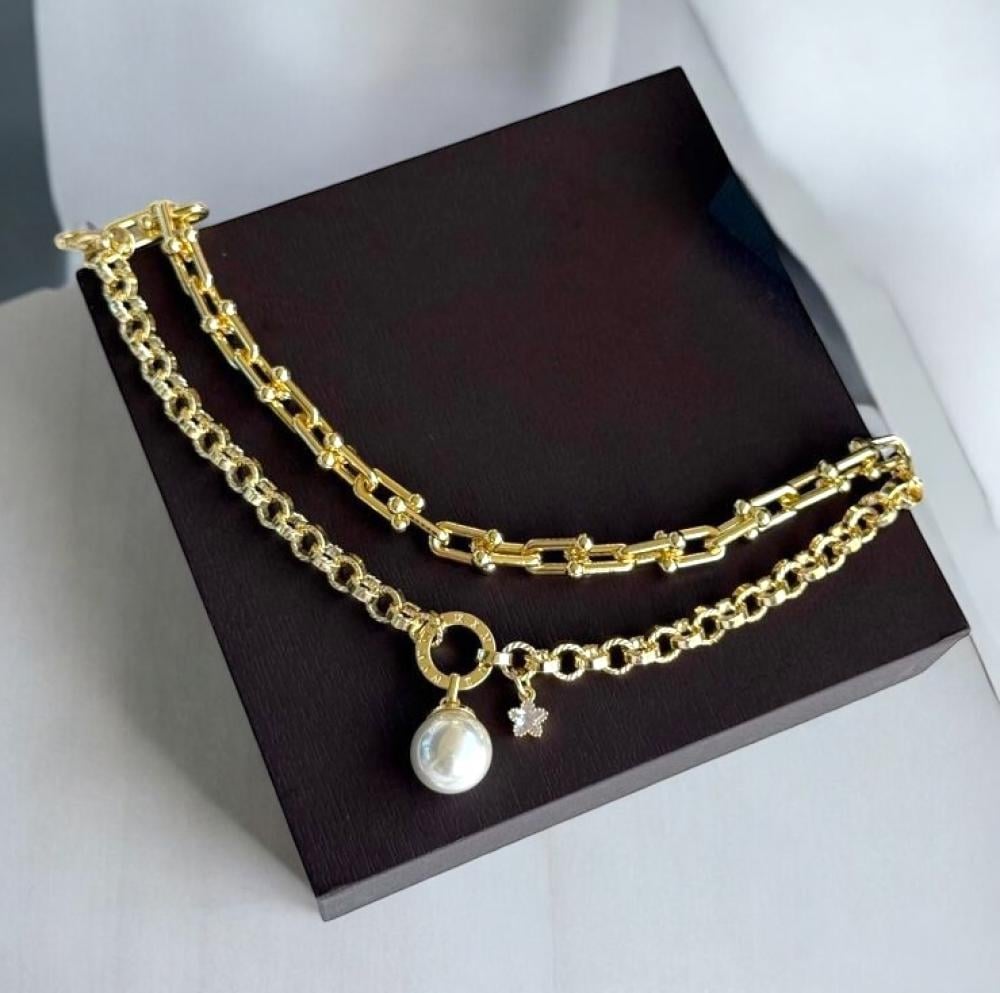سوار مزدوج مؤلف من جنزير بتصميم مستوحى من تيفاني والاخر بشكل حلقات متداخلة مزينة بحبة لولو كبيرة في الوسط مطلي ذهب عيار ١٤. MB-293