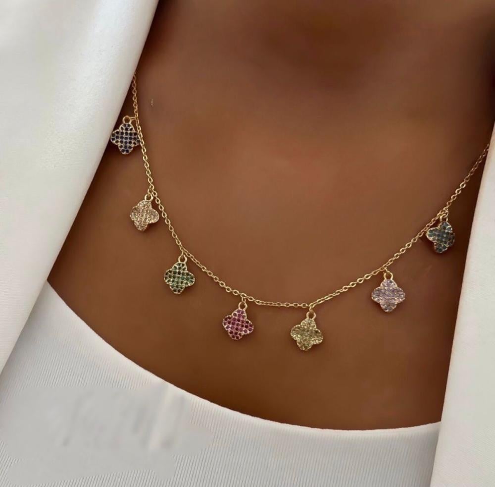 شوكر أنيق مطلي بالذهب، يتميز بسلسلة رفيعة تحمل تعليقات بشكل ورقة البرسيم الرباعية (Four-leaf clover). كل تعليقة مرصعة بفصوص لامعة بألوان متعددة (الوردي، البنفسجي، الأخضر، الأزرق، والذهبي)، مما يضفي لمسة مرحة وعصرية على التصميم.
