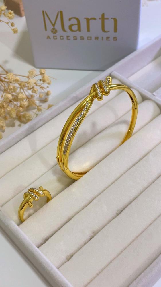 ✨ طقم اسوارة مع خاتم مطلي ذهب عيار 18 مستوحى من ماركة عالمية، بتصميم عقدة عصرية مرصعة بزركون لامع.