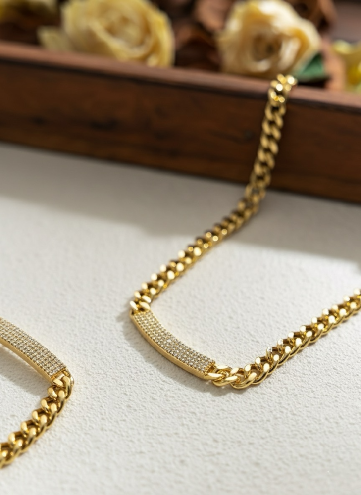 يتكوّن من سلسال ناعم وأسوارة متناسقة بإطار أسود لامع يبرز جمال الطلاء الذهبي الفاخر.