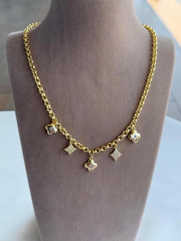 أضيفي لمسة من الفخامة إلى إطلالتك مع هذا الطقم الأنيق المطلي بالذهب، والمكون من سلسال أنيق وأساور جذابة مزينة بتعليقات متعددة بتصميم زخرفي فاخر. يتميز التصميم بالتوازن بين البساطة والرقي، ويُعدّ خيارًا مثاليًا للإطلالات اليومية أو المناسبات الخاصة.
